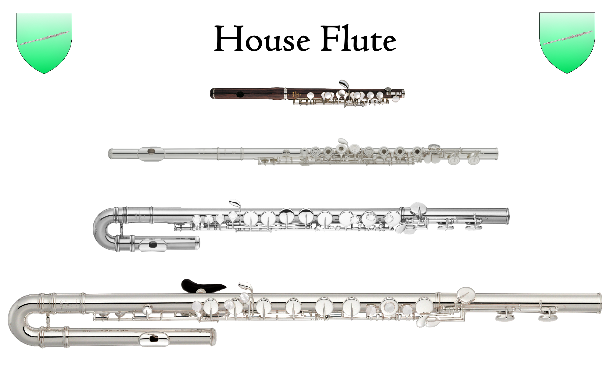 One family of instruments wouldn’t be a family if there was only one member, so using House Flute as an example we can see their members here from top to bottom: the Piccolo Flute, the Concert Flute, the Alto flute, and the Bass Flute. (To keep it simple we will exclude other members of the flute family that are rarely heard, like the Soprano Flute, the Treble Flute, the Flûte d’amour, and the Contrabass Flute, among others)