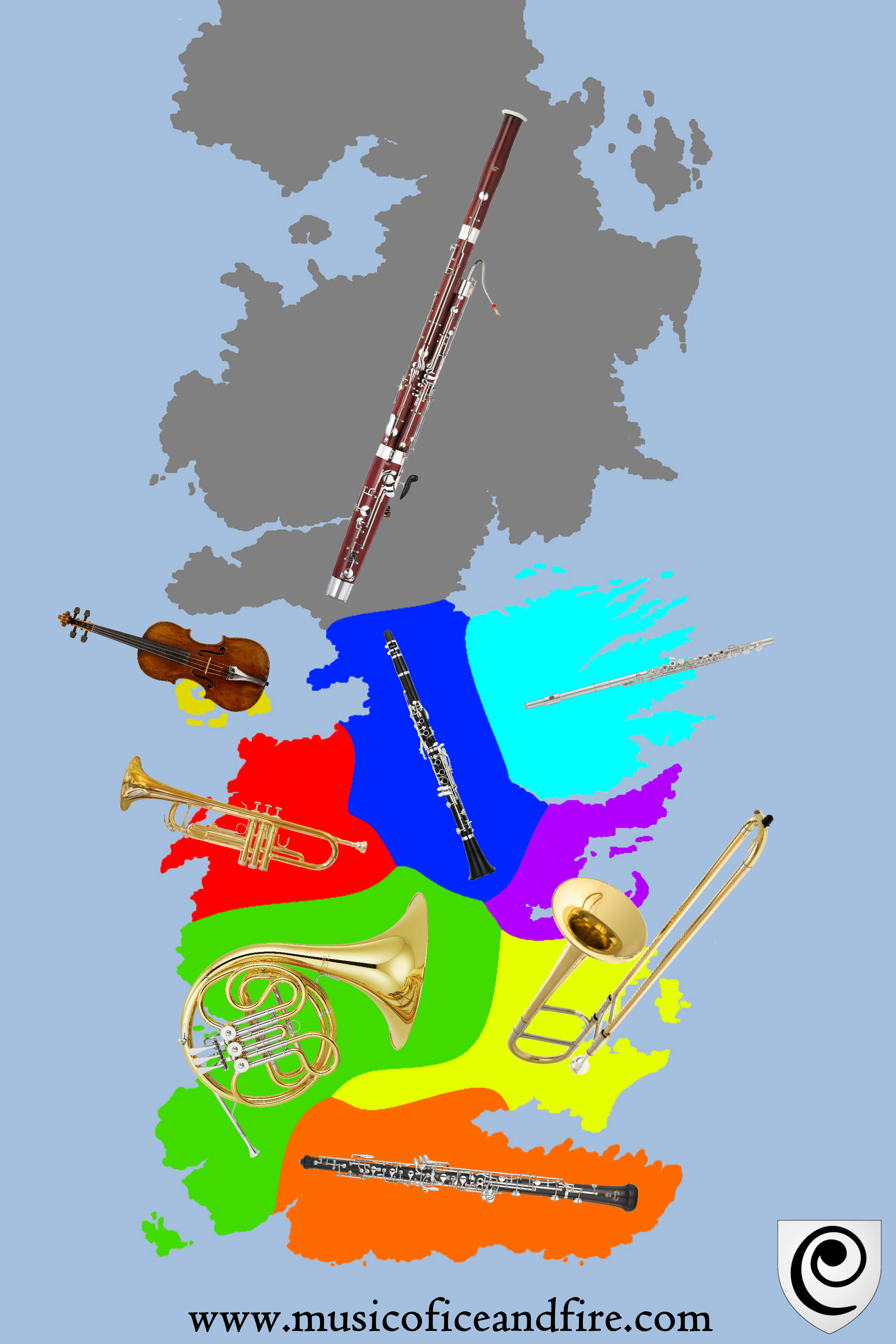 After that introduction to the instruments of the orchestra we can focus our attention to how all of this applies to Westeros. Each kingdom in Westeros has not only a distinct culture and traditions, but also geography, climate, food, religion, and of course musical instruments. There are families of instruments strongly associate with some regions as we can see in the map below: